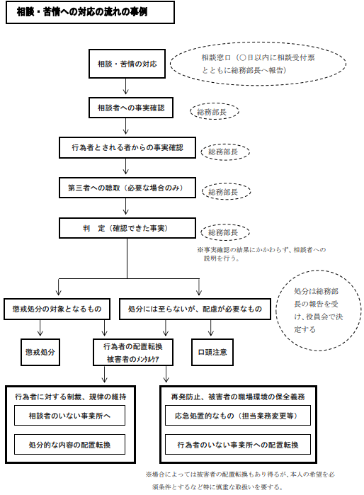 事実関係の確認ができた場合には、速やかに被害者に対する配慮のための措置を適正に行い,行為者に対する措置を適正に行います。