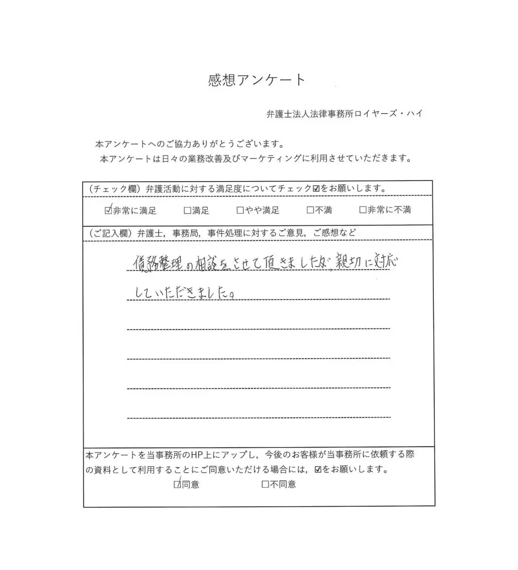 2023年9月1日 ITベンチャー 50代男性の方のご意見 Q 弁護活動に対する満足度についてチェックをお願いします。 非常に満足 満足 普通 不満 非常に不満 Q 弁護士、事務局、事件処理に対するご意見、ご感想など 色々な無理をお願いしたんじゃないかと思ったりもしましたが、全て解決していただき非常に感謝しています。 ありがとうございました。