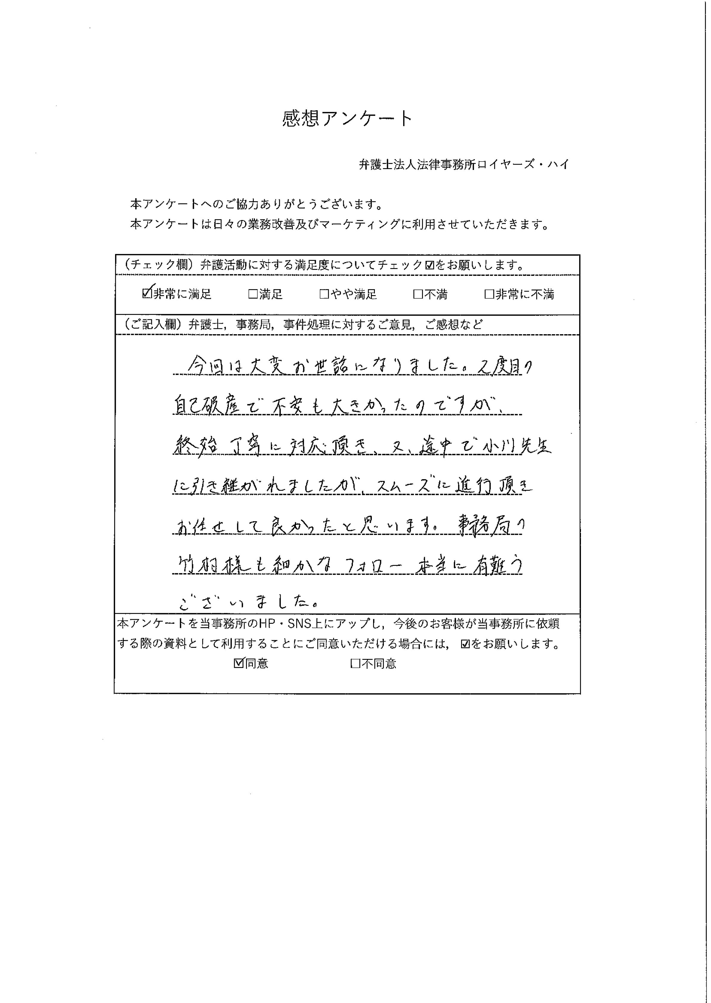 (50代 男性 自営業)「今回は大変お世話になりました。2度目の自己破産で不安も大きかったのですが、終始丁寧に対応頂き、又、途中で…」