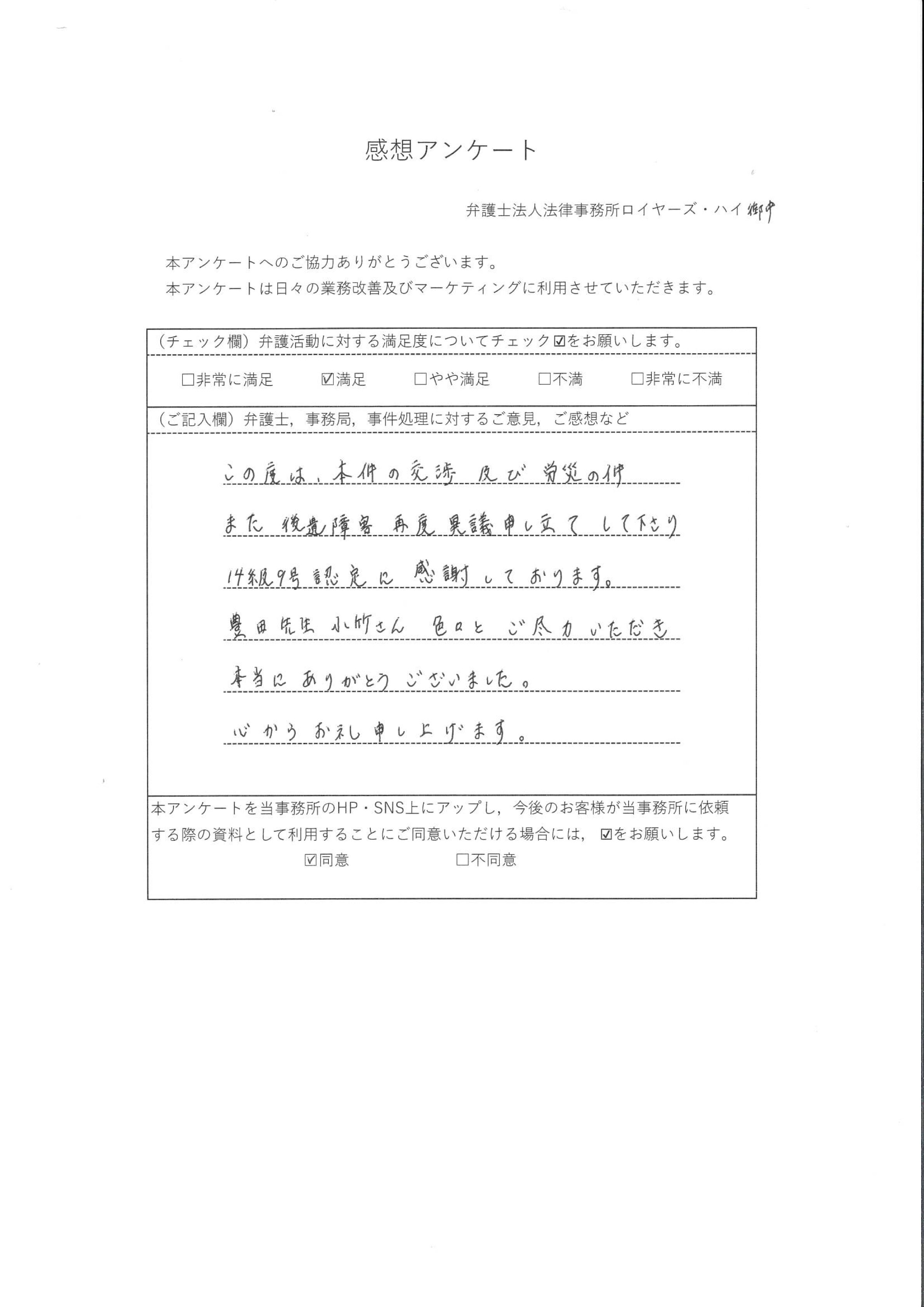 この度は、本件の交渉及び労災の件、また後遺障害再度異議申し立てして下さり、14級9号認定に感謝しております。